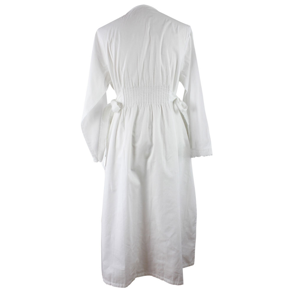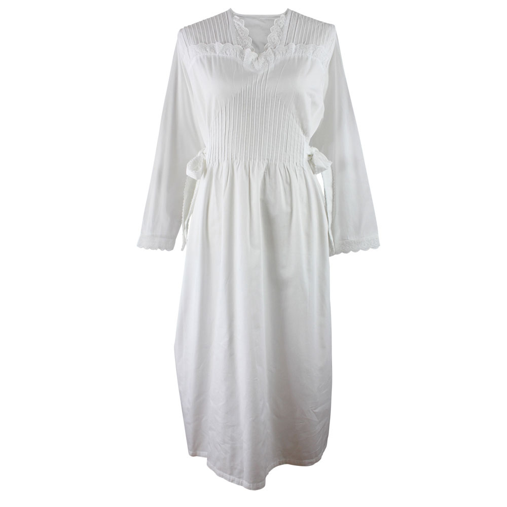 The long sleeves are also finished with matching cotton lace trim, while the waist is softly defined with neatly edged side ties, allowing you to adjust the fit to your preference. Crafted from 100% cotton, this nightdress has a slightly heavier weight, giving it a luxurious feel and graceful drape.